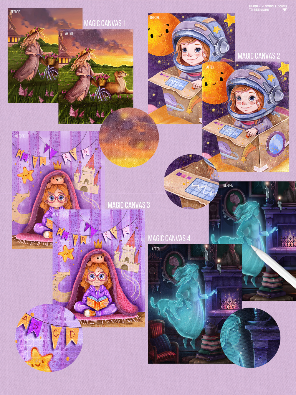 Feel free to use four Magic Canvases that come with Cute Children Illustration Procreate Brush Set. These are carefully crafted Procreate files with Draw Here layer - you can work there or even insert existing artworks to make them even more interesting.
