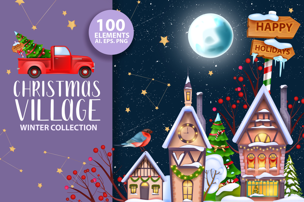 Christmas Village Winter Collection will come in handy for anyone looking to swiftly and effortlessly create custom pro-looking winter postcards, invitations, prints, presents, packages, etc. You will have 100+ design elements ready to combine including 9 premade compositions and 6 backgrounds at your disposal.
