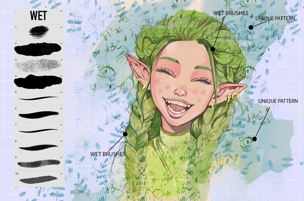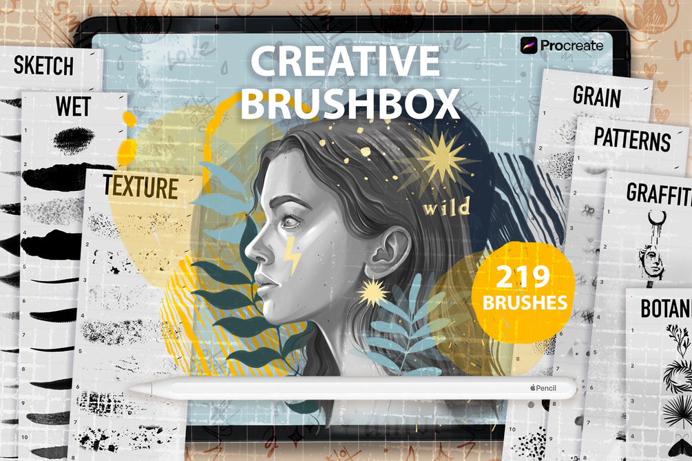 Procreate Creative Brushbox was made to help you draw unique illustrations with a lot of interesting detail and textures. To achieve that there are several categories of brushes that you will find inside this brushset: