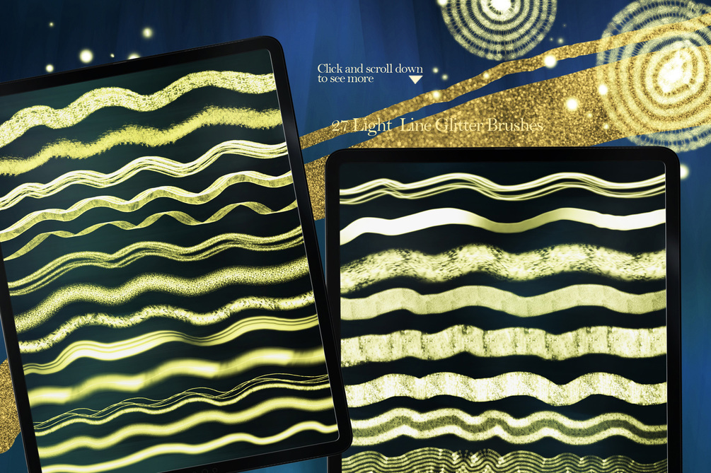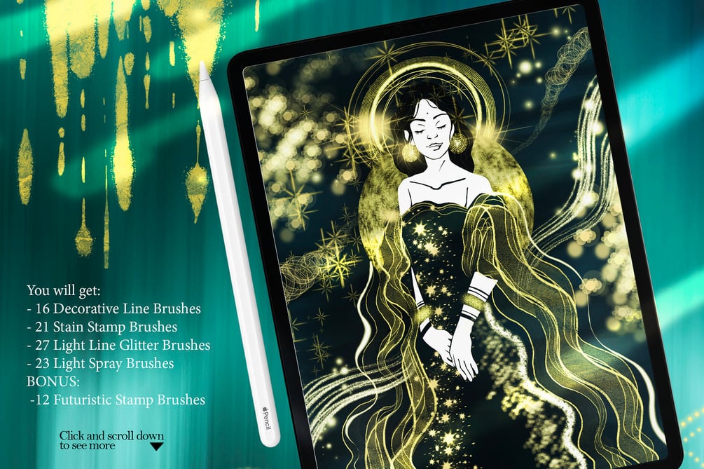 Inside Procreate Glitter and Gold Brushes you will find unique decorative line brushes for futuristic backgrounds. This Procreate brush set will also help to add unique feel to your fashion illustrations - you will be able to make realistic-looking cloth folds and lace with a few mouse clicks. Aero star glowing brushes will detalize and gliterize any content.