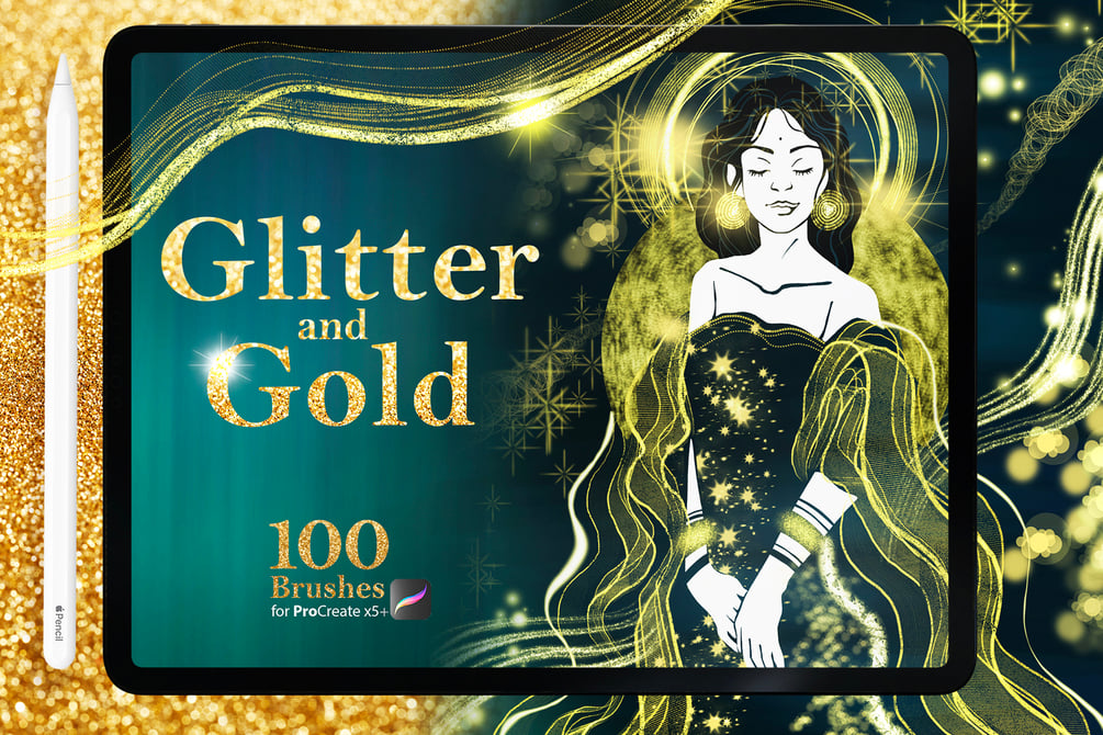Procreate Glitter and Gold Brushes set consists of 100 Line, Stamp and Spray brushes that will help you to add shine and glitter to your illustrations and characters.