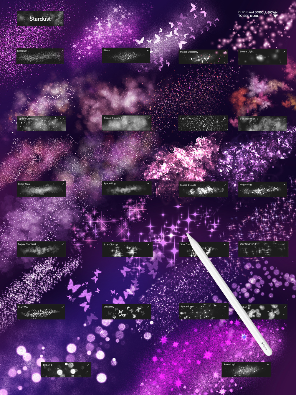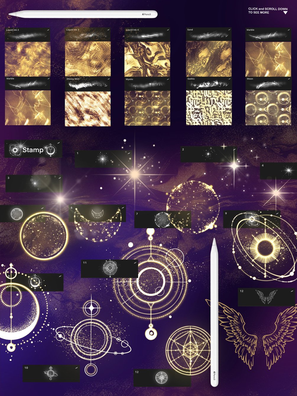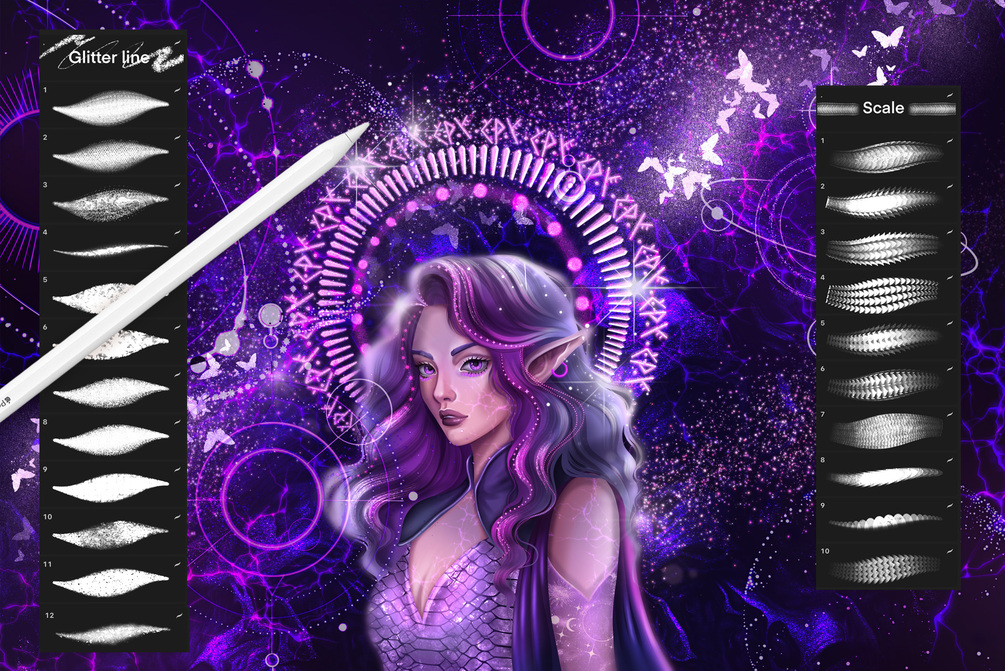 Check out stamps with flares and cosmic symbols as well as Shiny Texture collection to add more shimmer, sparkle and magic glitter to your artworks. Use different blending modes to achieve interesting results and make your drawings truly unique.