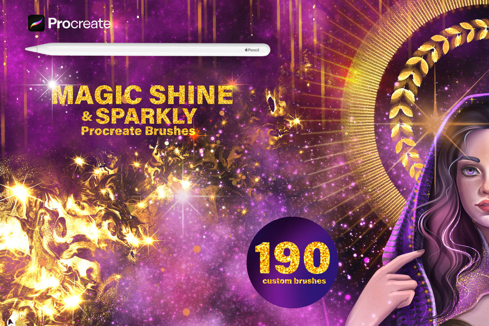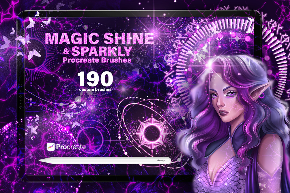 Shine & Glitter Magic Procreate Brushes is a huge, versatile and easy to use collection of unique custom decorative brushes It enables you to swiftly draw shiny magic symbols, gothic patterns, fairytale ancient runes, bolts of lightning, cracks, rays and various geometric shapes.
