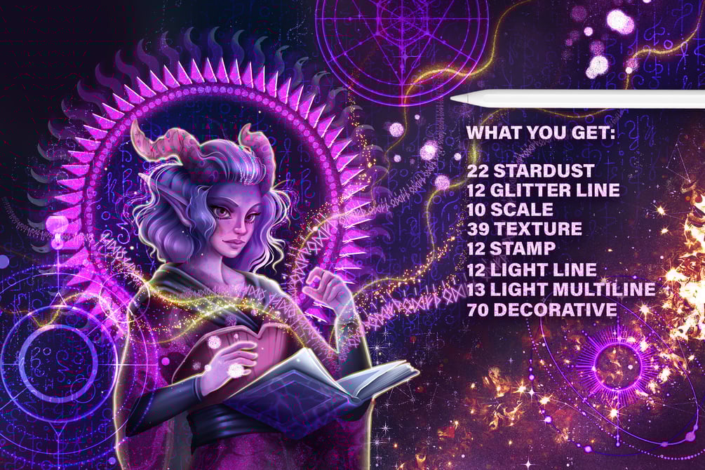 You will get 190 brushes to swiftly draw shiny magic symbols, gothic patterns, fairytale ancient runes, bolts of lightning, cracks, rays and various geometric shapes.