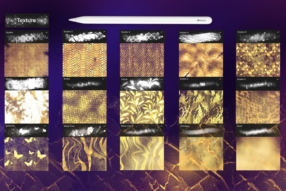Inside Shine & Glitter Magic Procreate Brushes there is everything to create magic shiny gold illustrations. The brushes can be used for virtually anything, from lettering to drawing fancy embellishments. Here you will find sky full of stars, paranormal magic constellations, interesting golden textures, shimmering metallic scales, shiny sparkle liners.